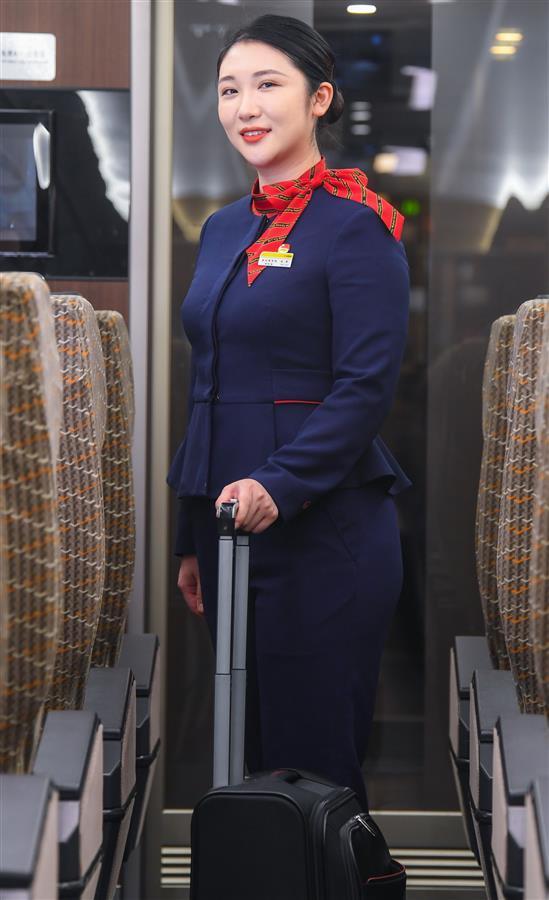 手持黑色小皮包,左臂佩戴专门臂章,列车开出武汉站不久,阮菁就在车厢内巡视起来。她告诉记者,除了着装配饰有所不同,列车长和普通乘务员的工作职责也有很大区别。