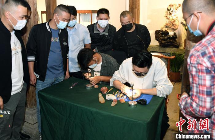 两名青年雕刻师现场展示“非遗”寿山石雕刻技艺。 记者刘可耕 摄