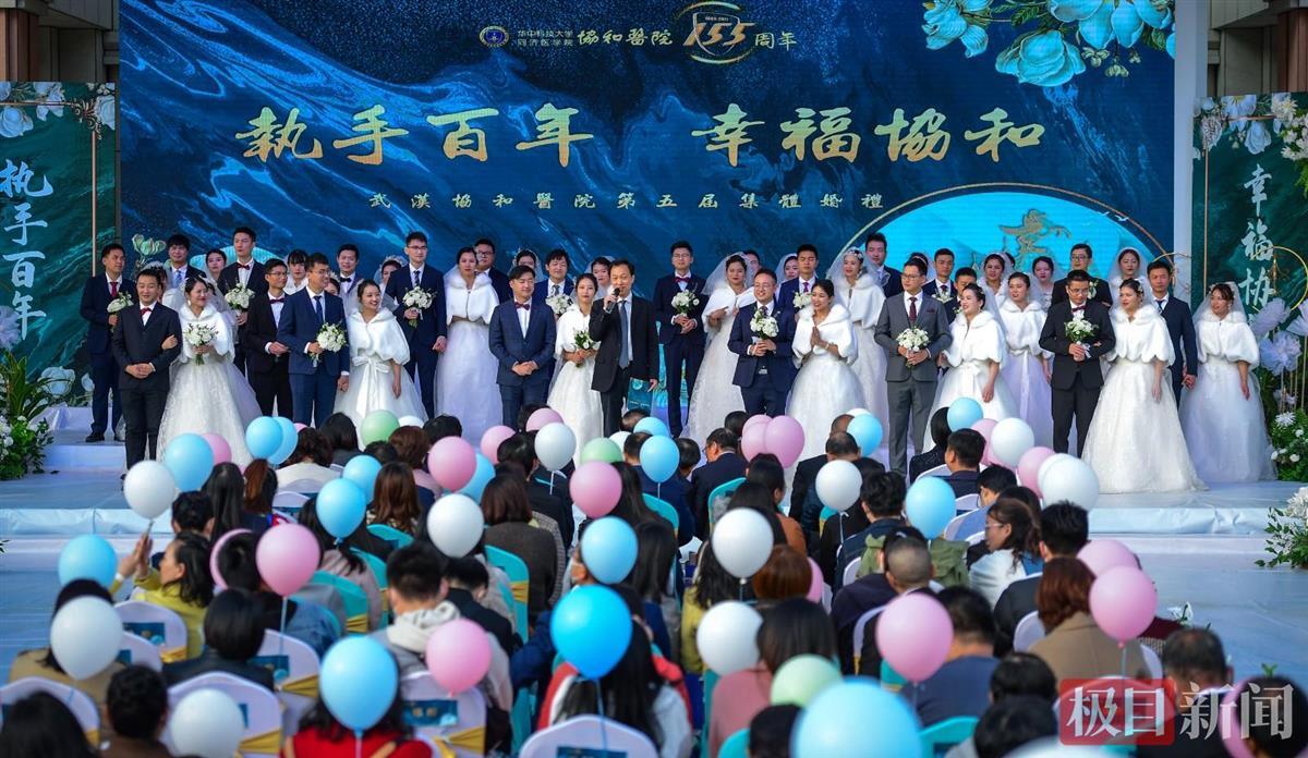10月21日下午,武汉协和医院“执手百年•幸福协和”集体婚礼在协和医院金银湖院区隆重举行,婚礼简约而热闹。