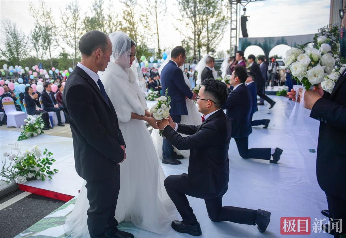 台上,90后新郎凌肯单膝跪地,向新娘王梦媛送上代表纯洁爱情的白玫瑰,并幸福拥吻,在场的亲友同事欢呼、鼓掌……