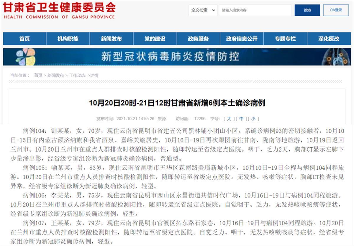 10月21日14时55分,甘肃省卫健委发布的疫情通报显示,10月20日20时-21日12时,甘肃省新增6例本土新冠肺炎确诊病例,其中4例为云南昆明到甘肃旅游的游客。