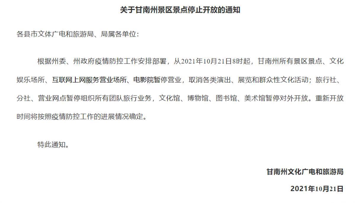 同时,甘南州的所有景点也被要求暂停营业。甘南州文化广电和旅游局发布通告称,从2021年10月21日8时起,甘南州所有景区景点、文化娱乐场所、互联网上网服务营业场所、电影院暂停营业,取消各类演出、展览和群众性文化活动;旅行社、分社、营业网点暂停组织所有团队旅行业务,文化馆、博物馆、图书馆、美术馆暂停对外开放。