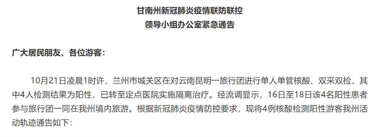 官方相关通报还提到,上述4名确诊老年游客均为云南昆明一旅行团成员,他们乘坐旅游大巴19日自甘肃宕昌县返回兰州,该团中有6人系此前确诊病例张某10月15日乘坐的D2746次列车6车厢同乘人员。