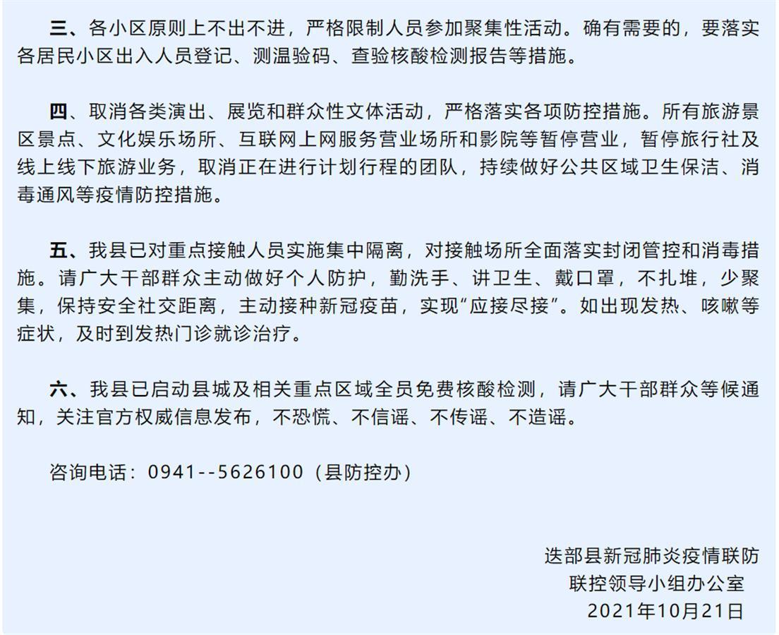 其中,迭部县21日还发布通告指出,各小区原则上不出不进,严格限制人员参加聚集性活动。确有需要的,要落实各居民小区出入人员登记、测温验码、查验核酸检测报告等措施。同时,该县也已启动县城及相关重点区域全员免费核酸检测。