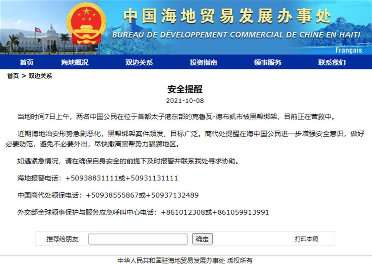 极目新闻记者注意到,中国海地贸易发展办事处在10月8日曾发布了一则通报称,当地时间10月7日上午,两名中国公民在位于首都太子港东部的克鲁瓦-德布凯市被黑帮绑架,目前正在营救中。