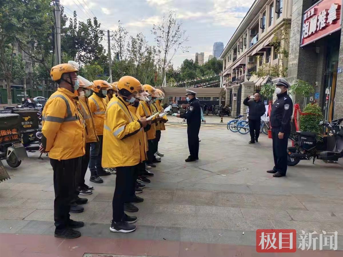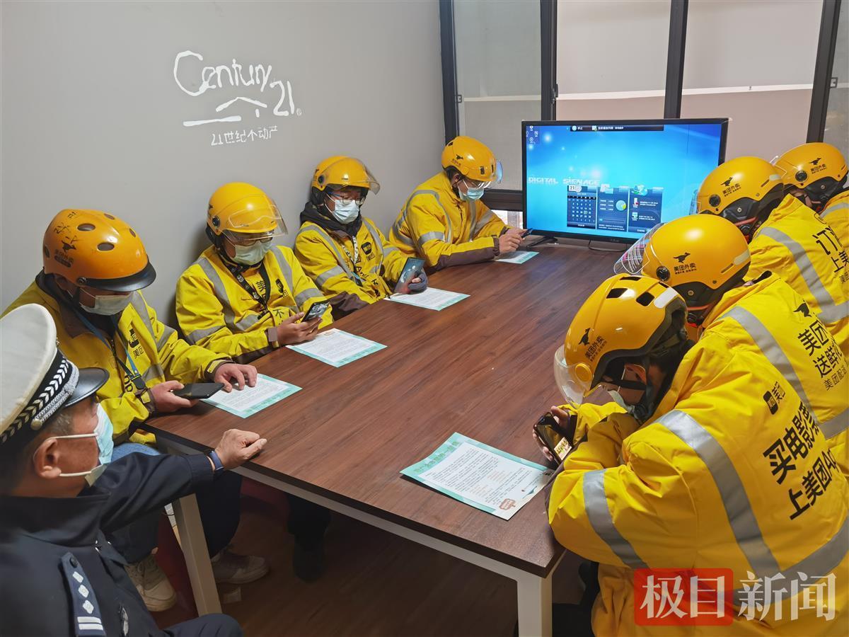 外卖电动车交通安全始终是电动车源头管理的重要内容。10月21日下午,车管中队副中队长张征带领民警吴世学等人深入辖区外卖配送点开展交通安全宣讲,民警重点讲解了外卖员在配送途中容易发生的闯红灯、逆行、走机动车道、边打电话边骑车等交通违法行为带来的危害,并通过播放鲜活的事故案例视频,着重讲解了发生事故时佩戴安全头盔与不佩戴安全头盔所带来的截然不同的后果,引导外卖小哥安全配送、守法出行。