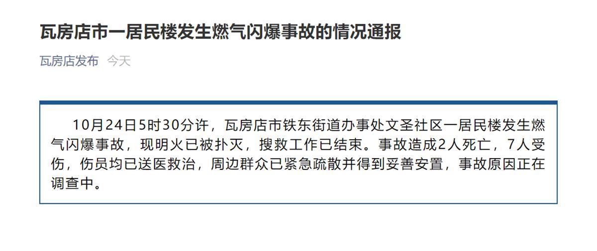 10月24日5时30分许,辽宁省大连瓦房店市铁东街道办事处文圣社区一居民楼发生燃气闪爆事故(极目新闻此前报道《辽宁一居民楼发生爆炸部分楼层坍塌,伤亡不明》),事故造成2人死亡,7人受伤,事故原因正在调查中。