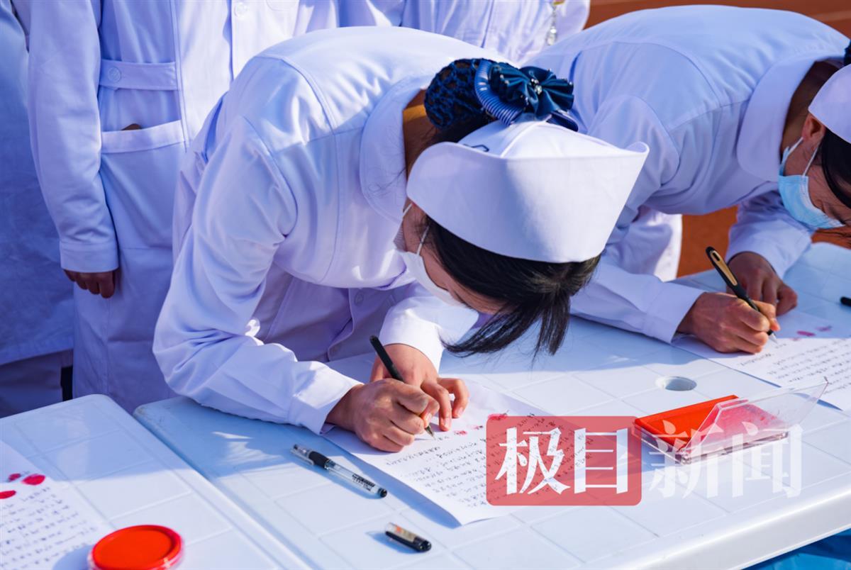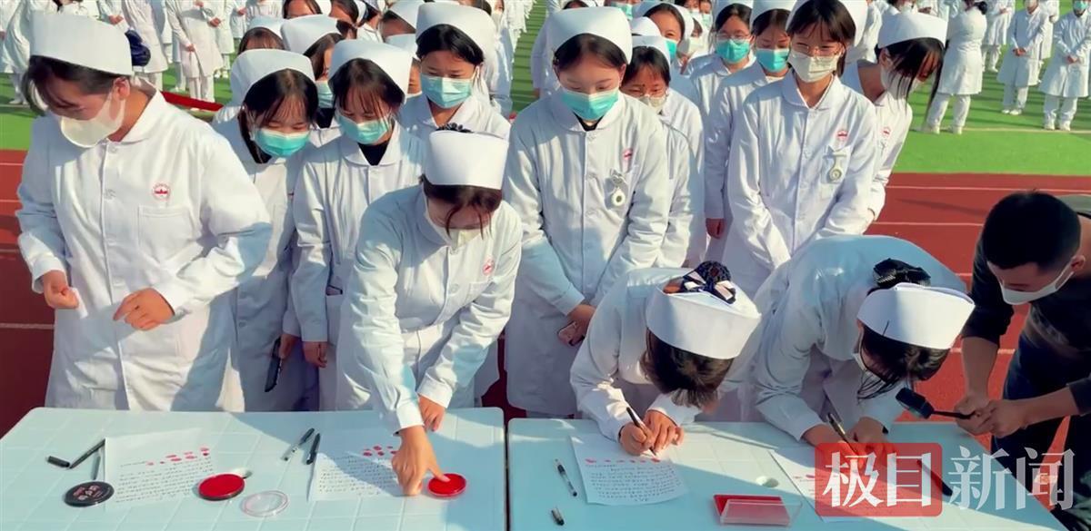 极目新闻记者注意到,同学们穿着护士服、全程佩戴口罩,队列整齐进行宣誓。宣誓结束后,大家纷纷在请战书上签字,并按下自己的手印。
