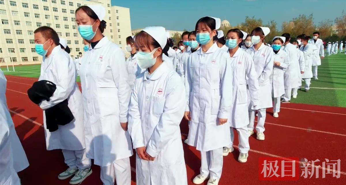 10月23日,兰州外语职业学院的200余名学生在学校操场集合,穿着护士服的学生们队列整齐进行宣誓,主动报名请缨参与抗疫。随后,同学们在抗疫请战书上签字并按上手印。极目新闻记者获悉,目前该学校正在培训报名学生,之后将安排至各个医院等抗疫一线单位。