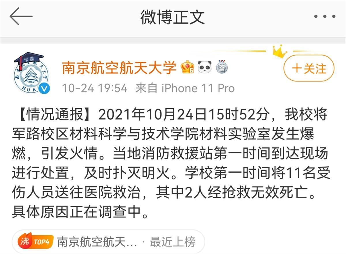 24日晚,南京航空航天大学官方微博通报,2021年10月24日15时52分,该校将军路校区材料科学与技术学院材料实验室发生爆燃,引发火情。当地消防救援站第一时间到达现场进行处置,及时扑灭明火。学校第一时间将11名受伤人员送往医院救治,其中2人经抢救无效死亡。具体原因正在调查中。