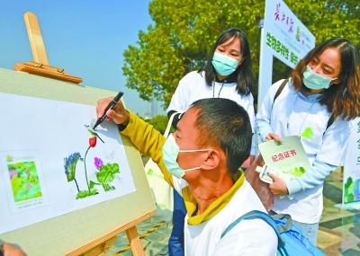 志愿者现场创作公园内的秋花,吸引人围观。