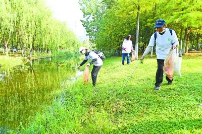 志愿者清理湖岸线边的垃圾。