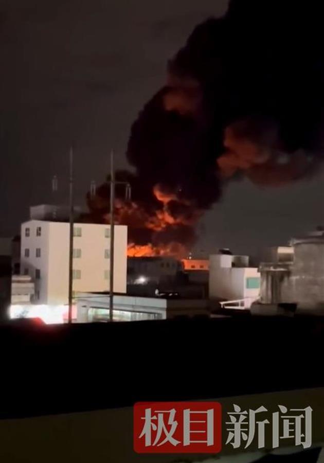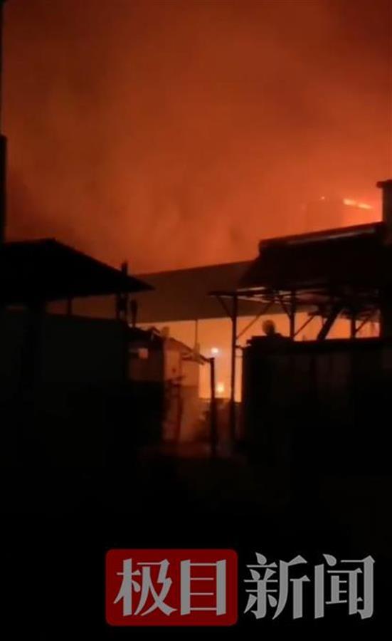 现场视频显示,厂区平房不断冒出熊熊火焰,黑烟滚滚直冲天际,数条街外也清晰可见。