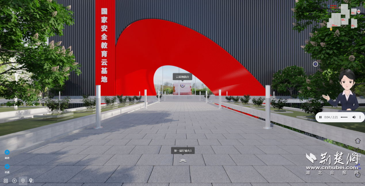 湖北省“国家安全教育云基地”建设规模宏大,总建设面积达1.3万平方米,共设立6个展厅,除序厅和尾厅之外,其他4个主题展厅分别是:“新时代国家安全概述”展厅、“国家安全实践”展厅、“国家安全教育”展厅、“国家安全观察”展厅。通过3D建模,实现多场景漫游、图片细节展示、视频学习、720度全景环视等交互体验,还设置了动漫机器人解说员“凤安安”自动导游、全程解说。