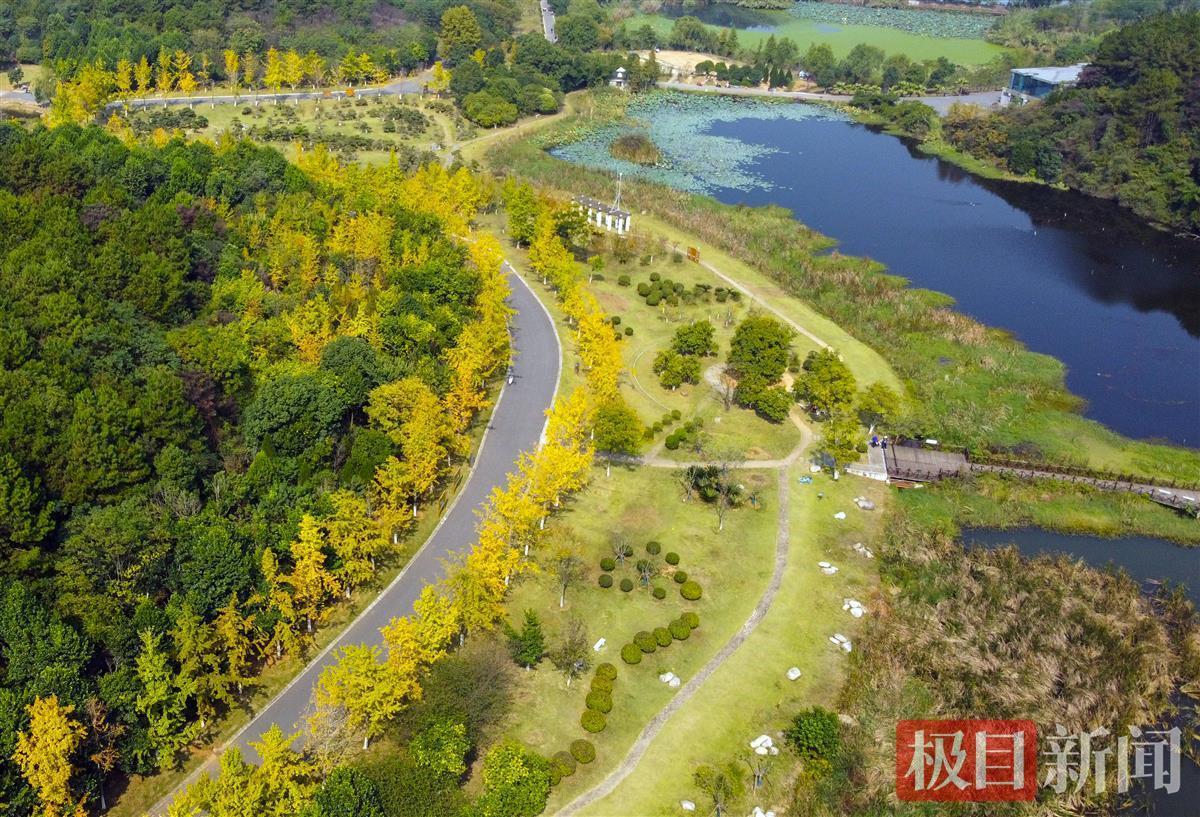 江夏汤逊湖边,藏龙岛国家湿地公园的秋色甚为浓烈,园内道路两侧的一株株银杏树已换上金色“秋装”,山顶道路及一侧边坡上,红枫负责晕染秋的浪漫。