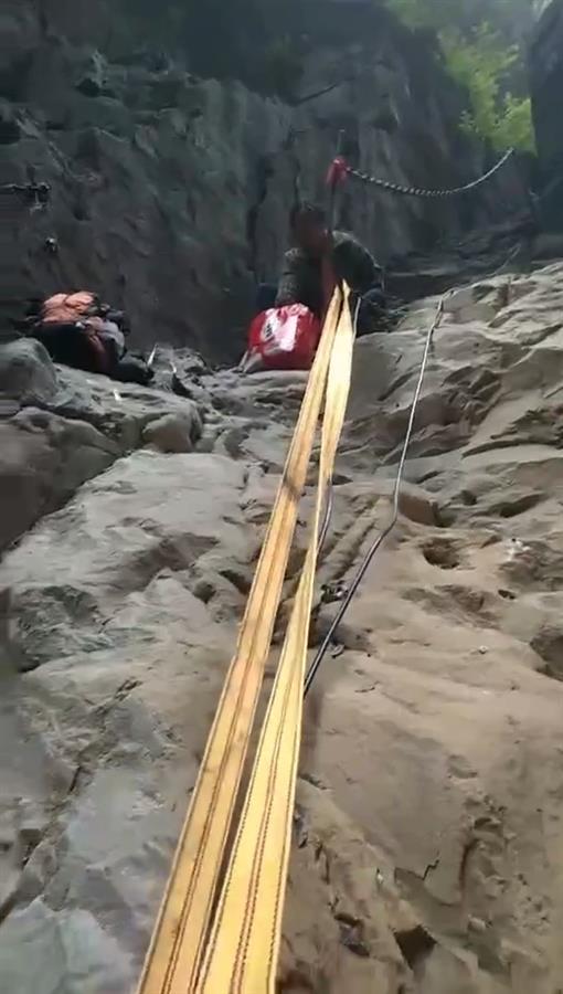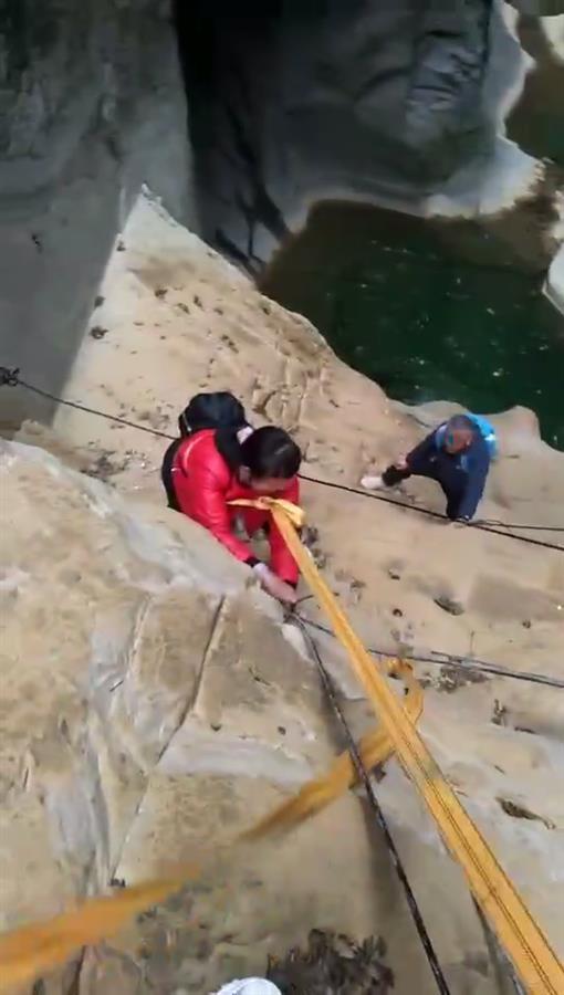 现场视频显示,一处悬崖边,多人身上绑着绳索,正在从悬崖顶部往下降,底部是一个水潭。另一段视频显示,山里一处岩石边,有多人站在附近等待,视频拍摄者称,“一线天,掉下去两个人,这里有信号,叫人来救人。”
