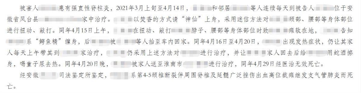 据安徽省凤台县人民检察院披露,52岁的陈某某(化姓)不识字,是安徽省蒙城县人。2021年3月上旬至4月14日,患有强直性脊柱炎的被害人叶某某(化姓)和邻居等人,每天到陈某某家中接受治疗。陈某某以焚香的方式请“神仙”上身,采用迷信方法对叶某某颈部、腰部等身体部位进行扭动、敲打。同年4月15日上午,陈某某在扭动、敲打叶某某脖子、腰部等身体部位时,致叶某某瘫软在地。对此,陈某某告知叶某某系“鳄鱼精”缠身,后叶某某被陈某某等人抬至车内回家。
