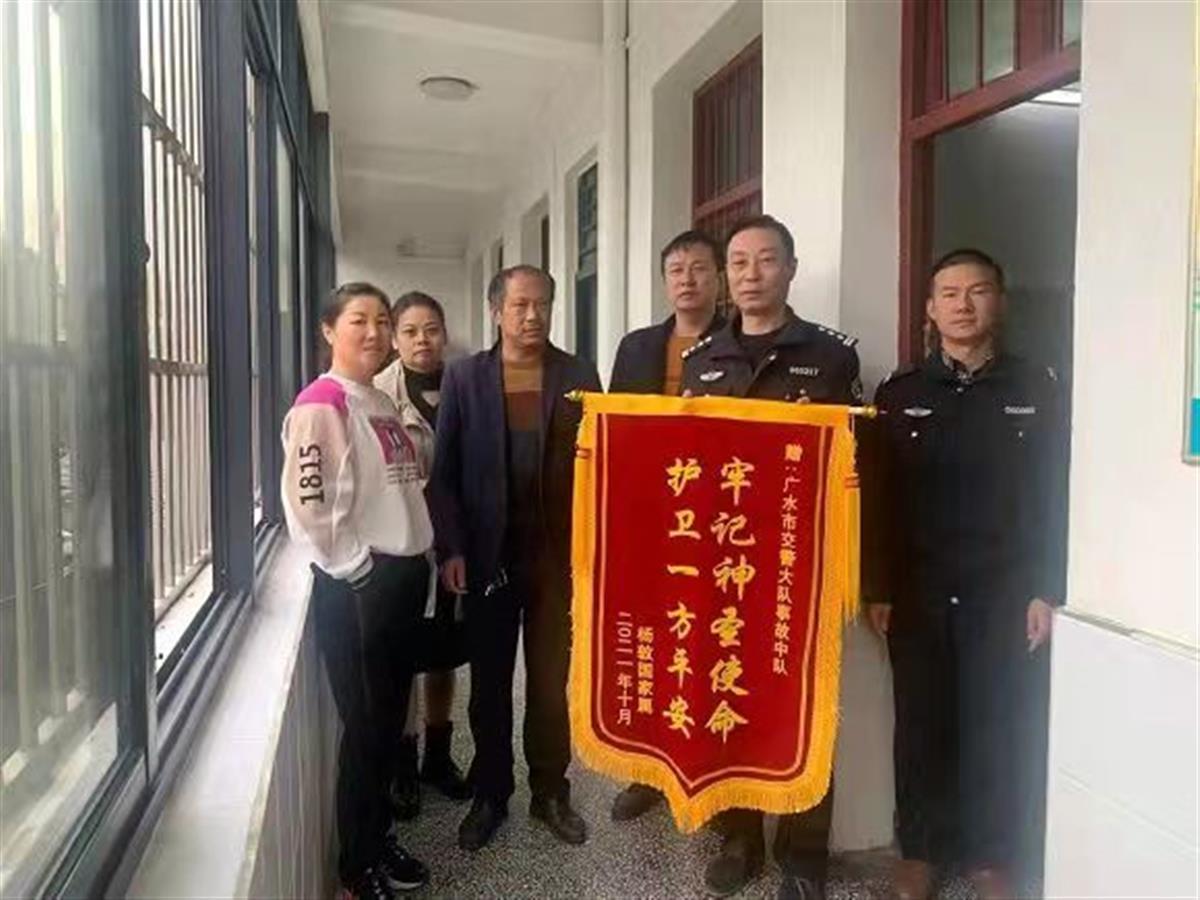 10月26日,这起交通肇事受害人的家属来到广水市公安局交警大队事故处理中队,特地赠送一面“牢记神圣使命、护卫一方平安”的锦旗,以表对民警的谢意。
