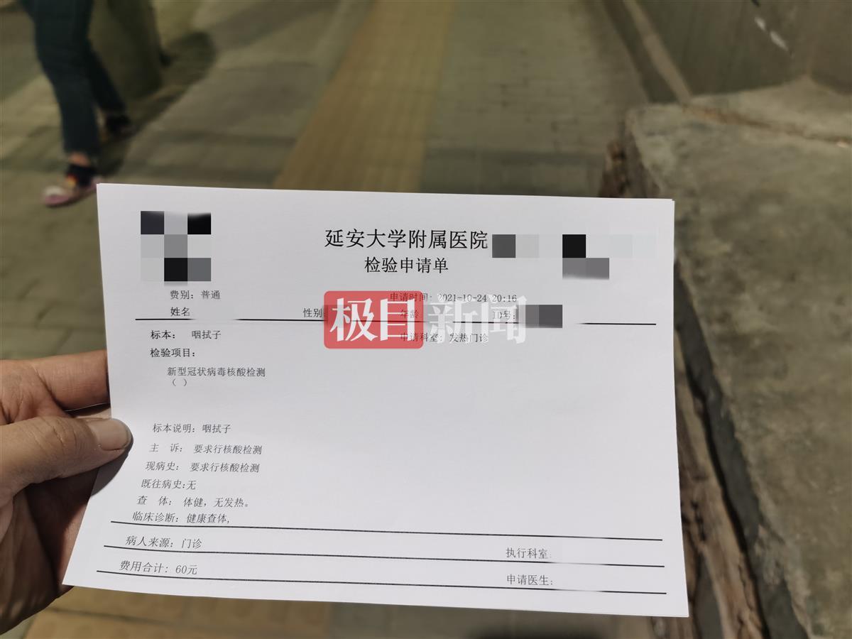杨先生介绍,10月24日,他从西安返回延安,当晚8时许来到延安大学附属医院进行核酸检测。