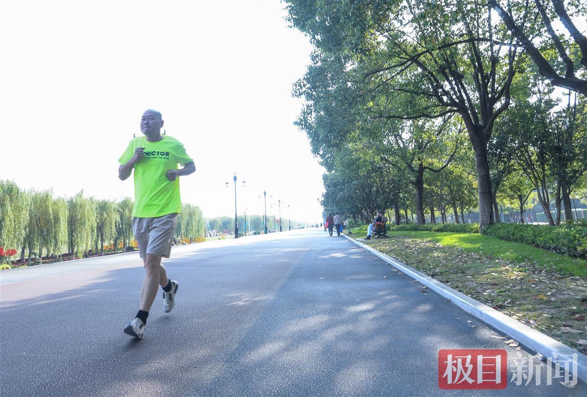 在汉口江滩公园,丛林、步道上阳光洒满,市民享受着晴好天气,惬意地在步道漫步,欣赏着公园美景。