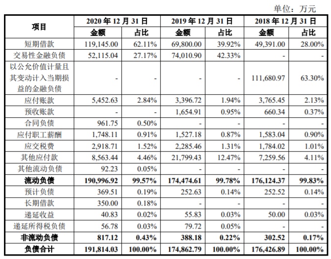 2017年至2020年各期末,梦金园的负债总额分别为185,160.43万元、176,426.89万元、174,862.79万元和191,814.03万元,其中流动负债占比99.84%、99.83%、99.78%和99.57%,原因是公司主要通过银行借款、向银行租赁黄金等形式取得融资。