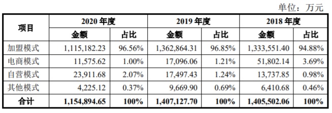 加盟模式销售收入占比超过93% 批发业务特征明显