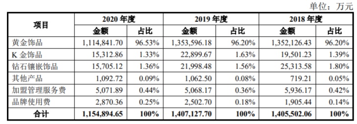 招股书披露,梦金园主要从事“梦金园”品牌黄金珠宝首饰的设计研发、生产加工、批发零售及品牌加盟业务,产品以高纯度黄金首饰为主,兼营钻宝玉石镶嵌、K金、铂金等饰品。