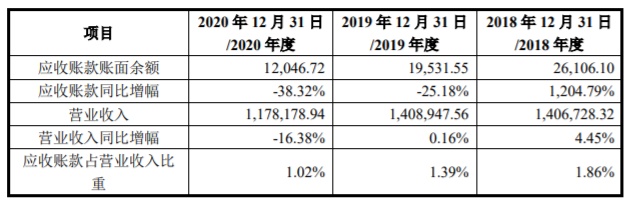 2017年至2020年各期末,梦金园的应收账款账面价值分别为1900.75万元、24,800.03万元、15,159.31万元和8605.52万元,应收账款账面余额分别为2000.79万元、26,106.10万元、19,531.55万元和12,046.72万元,占营业收入比重分别为0.15%、1.86%、1.39%和1.02%。