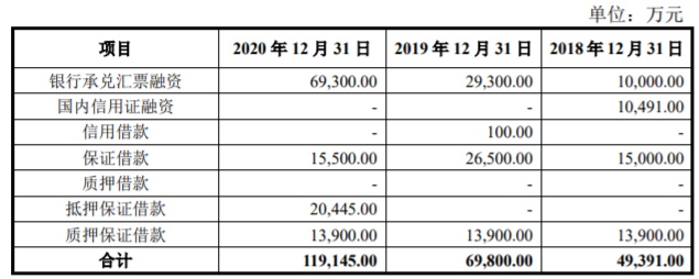 梦金园的短期借款主要为银行承兑汇票融资、保证借款和质押保证借款。2017年至2020年各期末,公司短期借款分别为37,900.00万元、49,391.00万元、69,800.00万元、119,145.00万元。