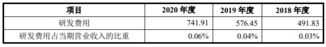 2017年至2020年,公司的研发费用分别为513.11万元、491.83万元、576.45万元和741.91万元,占营业收入比重仅为0.04%、0.03%、0.04%和0.06%。