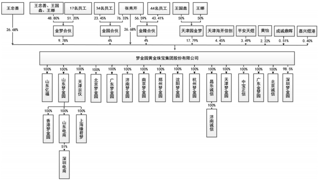 招股书显示,王忠善和张秀芹夫妇分别各自直接持有梦金园6000.00万股,合计直接持有梦金园12,000.00万股。此外,王忠善通过金梦合伙控制梦金园2200.00万股,张秀芹通过金园合伙和金隆合伙合计控制梦金园1800.00万股。因此,王忠善和张秀芹夫妇合计控制梦金园16,000.00万股,占比71.14%。二人为公司的控股股东。