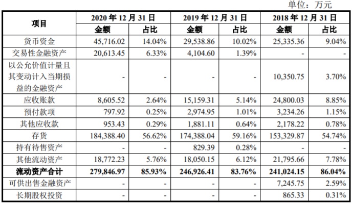 2017年至2020年各期末,梦金园的资产总额分别为245,615.70万元、280,117.10万元、294,785.61万元和325,679.62万元,其中流动资产分别为209,692.34万元、241,024.15万元、246,926.41万元和279,846.97万元,占比85.37%、86.04%、83.76%和85.93%。