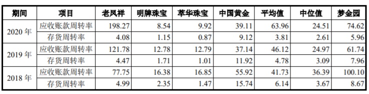 2017年至2020年各期末,梦金园的应收账款周转率分别为567.92%、100.10%、61.74%和74.62%,同行业可比公司平均值为37.64%、41.73%、46.12%和63.96%。