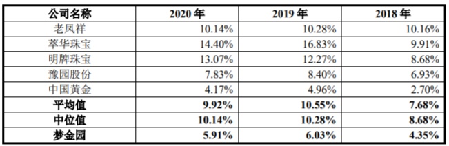 梦金园在招股书中解释称,公司综合毛利率略低于同行业可比公司平均水平,高于中国黄金,差异主要系产品结构、销售模式及品牌溢价等方面不同所致。