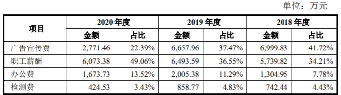 2017年至2020年,梦金园的销售费用分别为1.74亿元、1.68亿元、1.78亿元和1.24亿元,占营业收入的比例为1.28%、1.19%、1.26%和1.05%。其中,公司的广告宣传费为8244.84万元、6999.83万元、6657.96万元、2771.46万元。
