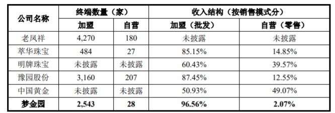在同行业公司中,2020年萃华珠宝、明牌珠宝、豫园股份、中国黄金的加盟收入占比分别为85.15%、60.43%、87.45%、50.93%,均显著低于梦金园。