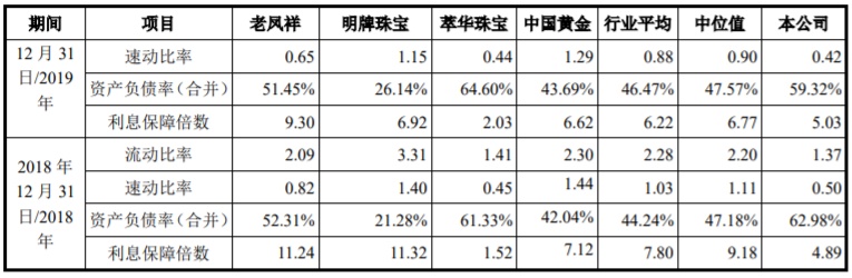 上述同期,梦金园的速动比率分别为0.33、0.50、0.42和0.50,同行业可比公司速动比率平均值分别为1.04、1.03、0.88和0.95,梦金园连续4年速动比率均远低于1,速动比率远低于同行业可比公司平均值。