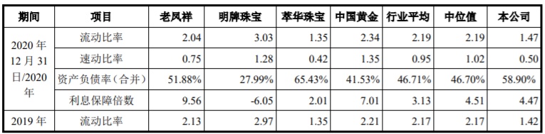 上述同期,梦金园的速动比率分别为0.33、0.50、0.42和0.50,连续4年速动比率均远低于1,同行业可比公司速动比率平均值分别为1.04、1.03、0.88和0.95。梦金园流动比率分别为1.13、1.37、1.42和1.47,同行业可比公司流动比率平均值分别为2.34、2.28、2.17和2.19。