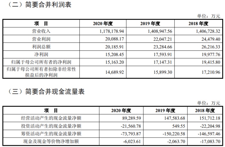 2017年至2020年,梦金园实现营业收入分别为134.68亿元、140.67亿元、140.89亿元和117.82亿元;实现归属于母公司所有者的净利润分别为1.51亿元、1.94亿元、1.71亿元和1.52亿元;公司经营活动产生的现金流量净额分别为14.46亿元、15.17亿元、14.76亿元和8.93亿元。2020年公司营收比上年同期下降16.37%,净利润同比下降11.11%,经营净现流金额同比下降39.50%。
