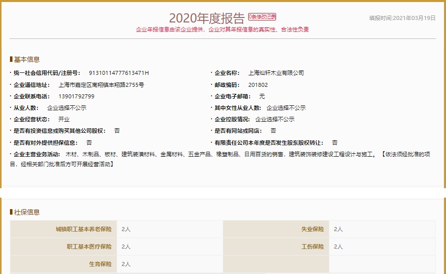据国家企业信用信息公示系统显示,上海灿轩木业有限公司2018年至2020年社会保险缴纳人数分别为1人、2人、2人。