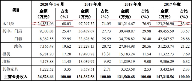2017年至2020年1-6月,梦天家居木门类收入占主营业务收入比例分别为83.67%、76.93%、74.05%、68.03%,其中,门扇收入占比分别为33.57%、29.98%、27.73%、25.47%,门套收入占比分别为28.88%、26.40%、25.59%、22.95%。