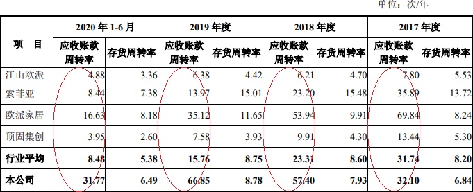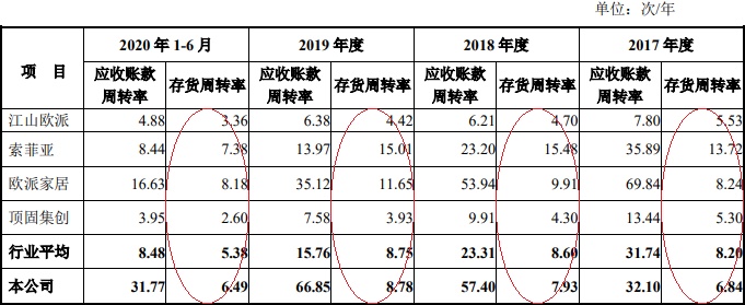 2017年至2020年1-6月,梦天家居应收账款周转率分别为32.10次、57.40次、66.85次、31.77次,同行业上市公司均值分别为31.74次、23.31次、15.76次、8.48次。