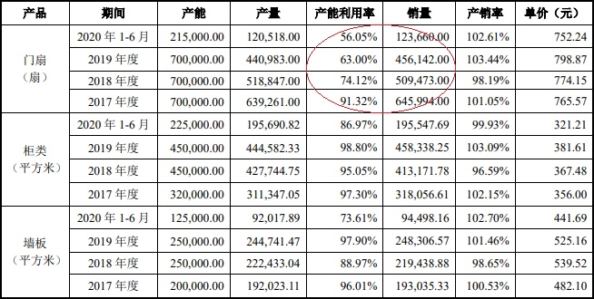2017年至2020年1-6月,梦天家居门扇产能利用率91.32%、74.12%、63.00%、56.05%。