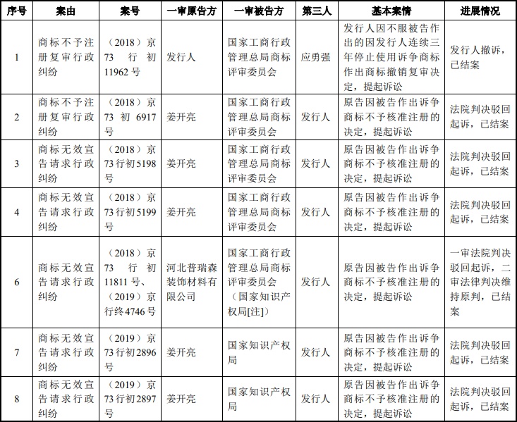招股书显示,梦天家居及子公司共存在11项商标诉讼事项,其中三项为商标侵权纠纷。此后,公司子公司浙江梦天被关联方双兔投资吸收合并而注销,双兔投资承继浙江梦天权利义务成为适格原告。公司前身梦天有限受让了第3072379号“梦天”商标申请参加该案诉讼,成为适格原告。案件重新审理期间,江山市开亮木门经营部停业而注销,原告撤回对其的起诉。