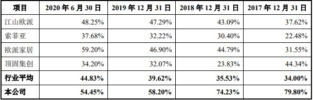 2017年至2020年1-6月,梦天家居同行业可比上市公司的母公司资产负债率均值分别为34.00%、35.53%、39.62%、44.83%。