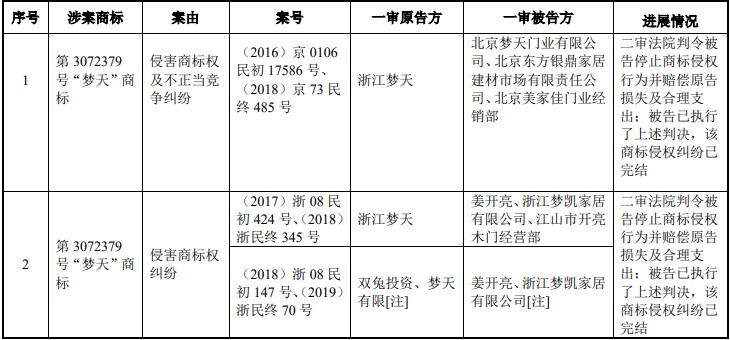 案号为(2017)浙08民初424号、(2018)浙民终345号的商标侵权纠纷显示,梦天家居子公司浙江梦天以侵害商标权纠纷起诉姜开亮、浙江梦凯家居有限公司、江山市开亮木门经营部,涉案商标为第3072379号“梦天”商标;案号为(2018)浙08民初147号、(2019)浙民终70号的商标侵权纠纷显示,梦天家居关联方双兔投资、梦天家居前身梦天有限以侵害商标权纠纷起诉姜开亮、浙江梦凯家居有限公司。前述两项商标侵权纠纷,二审法院判令被告停止商标侵权行为并赔偿原告损失及合理支出;被告已执行了上述判决,该商标侵权纠纷已完结。