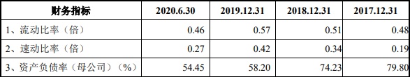 2017年至2020年1-6月,梦天家居流动比率分别为0.48倍、0.51倍、0.57倍、0.46倍,速动比率分别为0.19倍、0.34倍、0.42倍、0.27倍,资产负债率(母公司)分别为79.80%、74.23%、58.20%、54.45%。