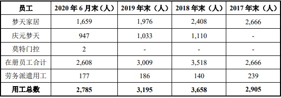 2017年至2020年1-6月,梦天家居及子公司用工总数分别为2905人、3658人、3195人、2785人,其中,在册员工分别为2666人、3518人、3009人、2608人。