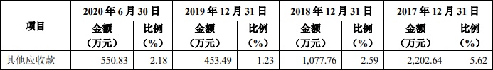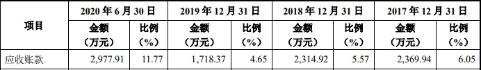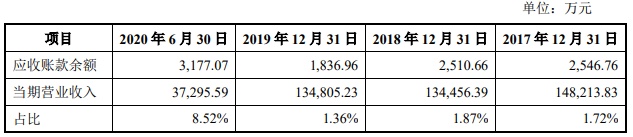 2017年至2020年1-6月,梦天家居应收账款账面余额分别为2546.76万元、2510.66万元、1836.96万元、3177.07万元,占当期营业收入比例分别为1.72%、1.87%、1.36%、8.52%。