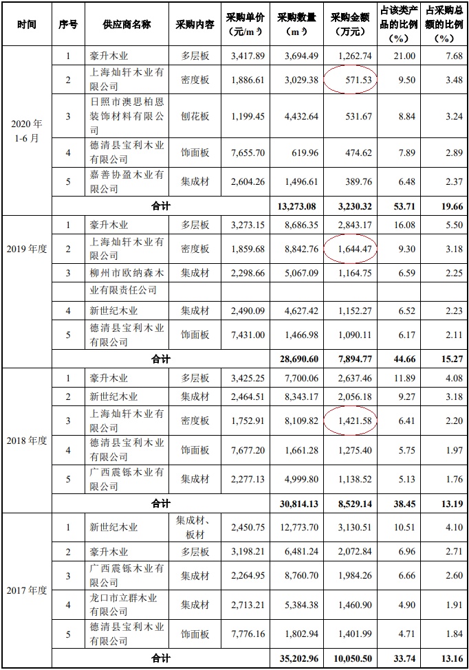 2017年至2020年1-6月,梦天家居对板材类原材料前五名供应商采购额分别为1.01亿元、8529.14万元、7894.77万元、3230.32万元。其中,2018年至2020年1-6月,上海灿轩木业有限公司位列梦天家居板材类原材料第三名、第二名、第二名供应商。